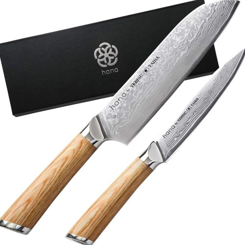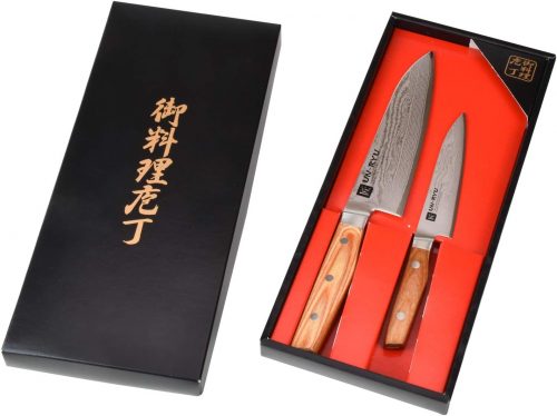 ダマスカス包丁2本がセットになった商品。三徳包丁とペティナイフが一緒に入っているになっており、さまざまな食材に対応できます。三徳包丁は肉や魚、野菜などの切り分けにおすすめです。ペティナイフは小さな果物などの切り分けに向いています。