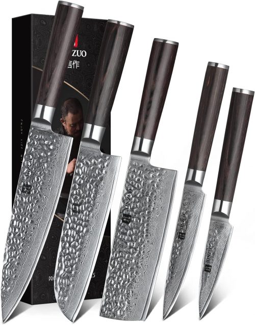 5本の異なる種類の包丁がセットされています。同じ意味で書き直すと: になっているため、さまざまな食材に対応できる。刃は鋭く、肉や野菜も好みの薄さに切ることができる。複数のダマスカス包丁が欲しい人におすすめの製品です。