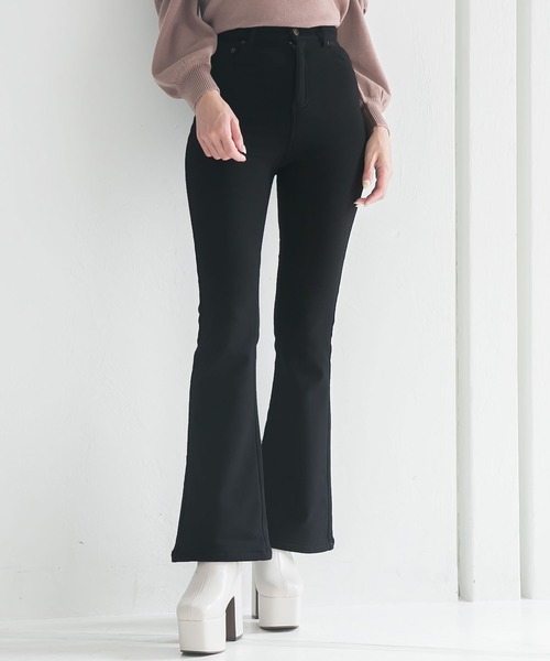 脚をスラリと長く見せる効果が期待できる、フレアシルエットのレディース裏起毛パンツです。もこもこ、ふわふわの質感が特徴のフリース生地を裏面に採用しています。ストレッチ性に優れているので、しっかりと暖かいのにゴワつきにくく、快適な履き心地を実現しています。