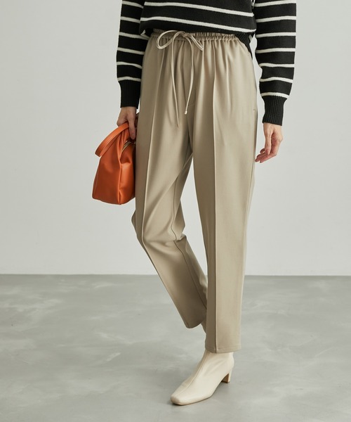 使いやすい、シンプルなレディースパンツです。テーパードシルエットとセンタープレス入りのデザインが特徴で、オフィスカジュアルスタイルにぴったりです。普段のお出かけには、スウェットやTシャツと組み合わせてややカジュアルに着こなすのもおすすめです。