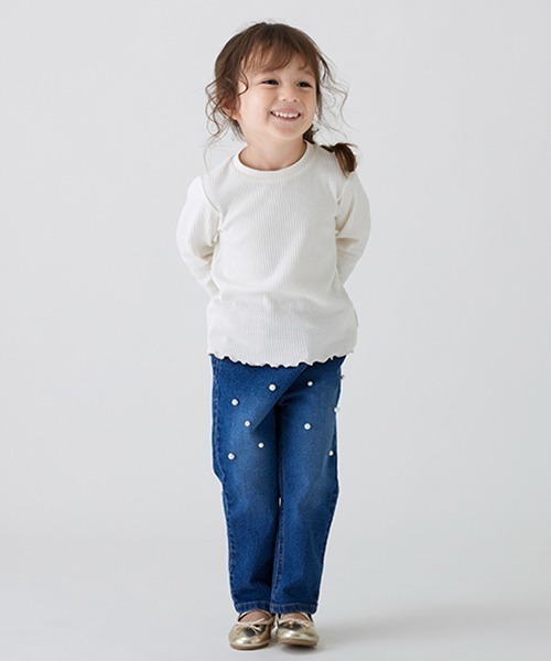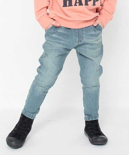 アクティブに動き回る子供も安心して着用できる、定番のデニムストレートパンツ。ウエストは、ボタンの位置を変えることで、簡単にサイズを調整できます。また、深めの股上設計もポイントです。