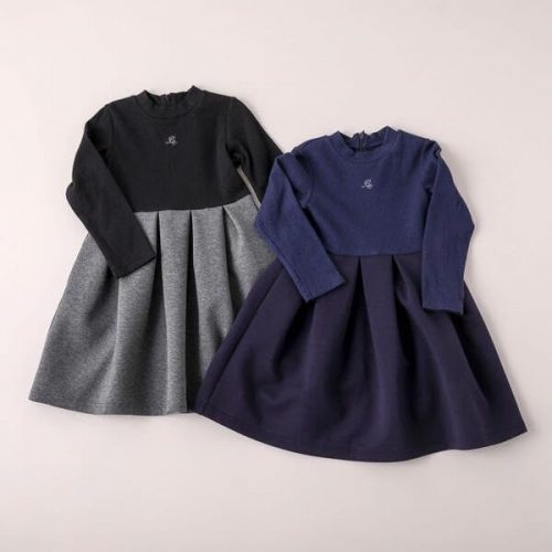 意味が変わらない場合は、次のように書き直すことができます: おしゃれな子供服の切り替えデザイン。ボンディング素材とニットコールを使った、膝丈のワンピースです。大人っぽく着こなせるシックなネイビーとグレーの2色展開です。