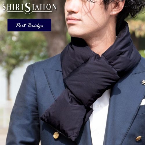 ビジネスシーンで便利なダウンマフラー。シンプルな無地デザインで、スーツやフォーマルなコートスタイルにも違和感なく調和するアイテムです。