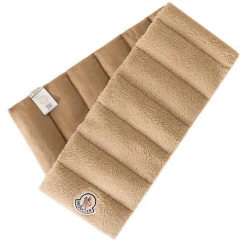 もこもこのボアとウールを組み合わせたリバーシブル仕様のダウンマフラーです。横のキルティングデザインが目立ちます。先端にはブランドのアイコニックなロゴパッチが配置され、高級感があります。