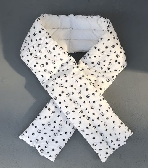 フランスのファッションブランド「ルシアンペラフィネ」のダウンマフラー。ブランドのアイコニックなスカルとリーフのモノグラムがあしらわれており、エッジの効いたデザインが魅力。白を基調としたモノトーンカラーで、使い勝手も良いのもポイントです。