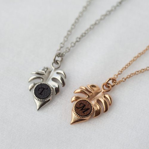 葉先に取り付けられたフェイクレザーには、お互いのイニシャルを彫刻することができます。イニシャルレザーの色は、ブラック、ブラウン、レッドブラウンの3種類から選ぶことができます。イニシャルを刻印したペアネックレスは、絆をより強めたいカップルにおすすめです。