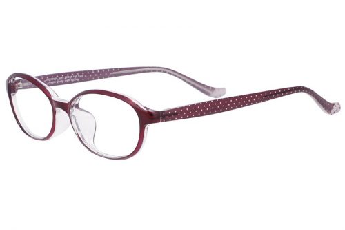 ゾフから展開されている、オーバル型のレディース用丸メガネ。色合いにはピンクやパープルが採用されており、またテンプル部分にはかわいい柄があしらわれています。