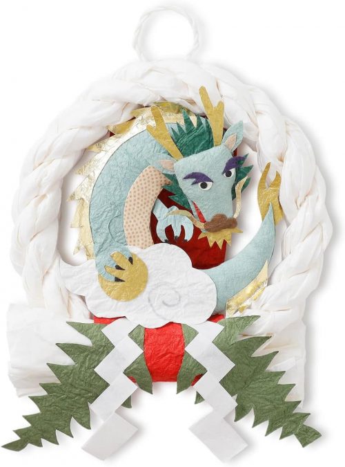 白い和紙で作られた注連和紙を使用した正月飾りです。紙製のリースには、龍のふっくらとした押し絵がデザインされています。丸いフォルムも特徴で、円満を表しています。ナチュラルでかわいいデザインの正月飾りをお求めの方にぴったりです。