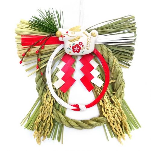 干支のモチーフが付いたリース型の正月飾りです。新潟県南魚沼産の稲藁をたっぷり使用しました。縁起の良い稲穂の他に、紅白の紙垂と水引などが飾られており、正月らしさを演出しています。