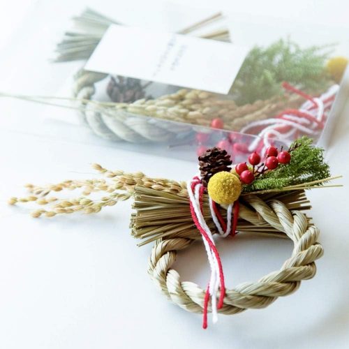 しめ飾りの手作りキットです。藁素材のしめ縄本体に加え、稲穂・タチカズラ・南天などの5種類の植物を使った飾り付けがセットになっています。手軽にハンドメイドを楽しむことができますよ。