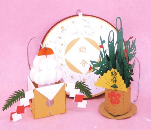 正月飾りはペーパークラフトで作られており、門松、鏡餅、迎春の3つのペーパーオーナメントがセットになっています。紙製ならではの素朴な雰囲気と、繊細なデザインが魅力です。
