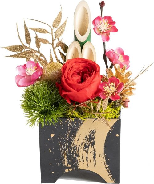 プリザーブドフラワーで華やかにアレンジされた正月飾りです。門松のオブジェに高級なカップ咲バラを組み合わせた和風モダンなデザインが魅力。梅の花や金の松笠も添えられ、正月を縁起よく演出します。