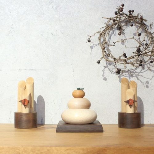 一つひとつ手作りされた木製の鏡餅の正月飾りです。特徴は、国産のメープル材を使用していること。清潔感のある白木は、柔らかな印象でインテリアに馴染みやすく、さらに時間の経過とともに飴色へと変化する経年変化も楽しめる魅力があります。