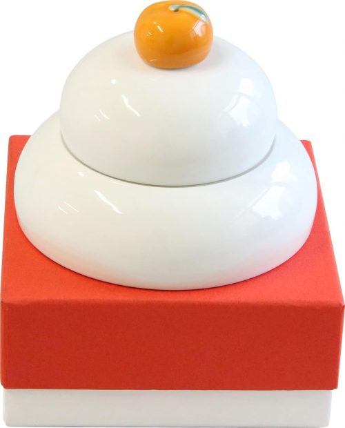 器としても利用できる波佐見焼のユニークな正月の飾りです。波佐見焼は長崎県で作られ、400年以上の歴史を持ち、美しい白磁と繊細な染付技術が特徴です。このセットには大きさの異なる2つの器とみかんの箸置きが含まれており、重ねて鏡餅の装飾としても使用することができます。