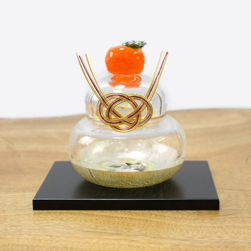 ガラス製の鏡餅の正月飾りです。職人の手によって一つひとつ丁寧に作られており、その美しさに魅了されます。光が反射することで気泡が輝き、ガラス独特の透明感と存在感を楽しむことができます。