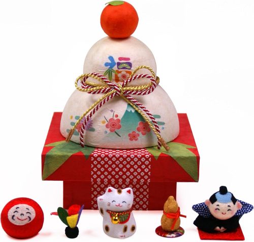 鏡餅のほかに、小さなかわいいちりめん細工の五福が付いているのもポイント。七転八起・家内安全の意味を持つダルマや、邪気をはねよける追羽根の他、ひょうたん・招き猫・福助の縁起物が、正月をおめでたい雰囲気に演出します。