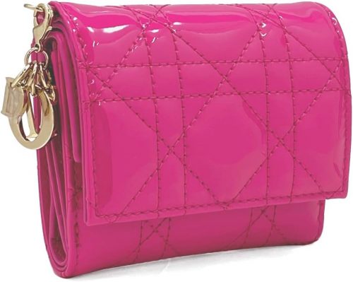 「レディディオール」シリーズの三つ折り財布は、ツヤやかなパテントレザーを使用しています。鮮やかなピンクカラーが目を引く可愛らしいデザインが魅力です。カナージュステッチとゴールドのロゴチャームが際立ち、持つだけでコーディネートを華やかに演出するアイテムとなっています。