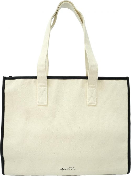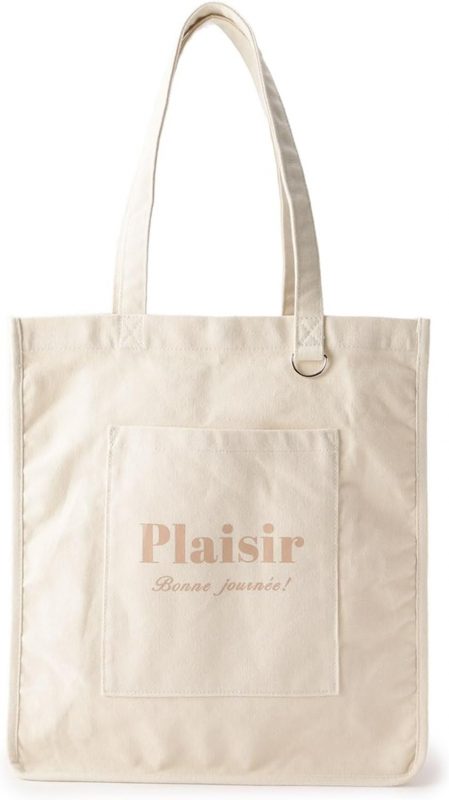 バッグの本体には、オーガニックコットンのキャンバス素材を使用しています。きれいめでガーリーな雰囲気がお好みの方にぴったりです。サイズは縦33cm×上部横53.5cm×マチ15.5cmです。持ち手の長さは60cmです。
