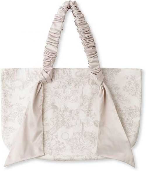 ヨーロピアンな柄がプリントされた、エレガントな推し活バッグ。くしゅっと寄せられた持ち手と大きめのリボンがフェミニンな印象を与えます。