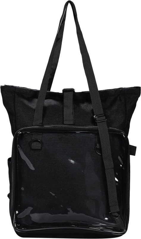 約42cm縦×30cm横×10cmマチの大きめサイズの推し活バッグ。リュックとトートバッグの2WAYで使える便利なアイテムです。フロントには約30cm×27cmの大きなクリアポケットが付いています。推しの缶バッジやぬいぐるみをディスプレイしながら持ち運ぶことができます。
