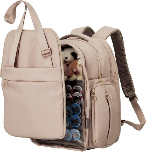 本体には透明な窓が付いていて、ぬいぐるみや缶バッジをディスプレイすることができます。フロントパーツを上から取り付けると「擬態モード」になり、取り外すと「推し活モード」にアレンジすることができます。内側にはノートパソコンが収納できる大きめなポケットなど、計5つのポケットが搭載されています。