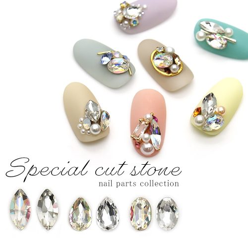 華やかなネイルを作りたい方におすすめの、特殊カットストーンがあります。ティアドロップ、オーバル、リーフなど、様々な形のバリエーションが揃っています。カラーは、オーロラとクリスタルの2種類を展開しています。ご自身の好みに合わせてお選びください。