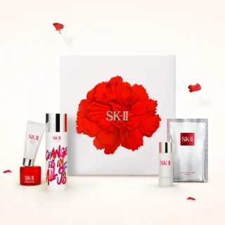 洗顔料・拭き取り化粧水・パック・乳液のサンプルと、化粧水本品75mlがセットされた限定のスキンケアセット。ボックスには赤いカーネーションがデザインされており、母の日ギフトにぴったりです。