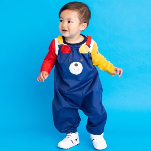 かわいいくまの顔がフロントにあしらわれたプレイウェア。サロペットタイプなので、半袖や長袖など、季節に合わせてインナーを合わせられます。ゆったりしたサイズ感なので、厚手の洋服をなかに着込ませることも可能です。