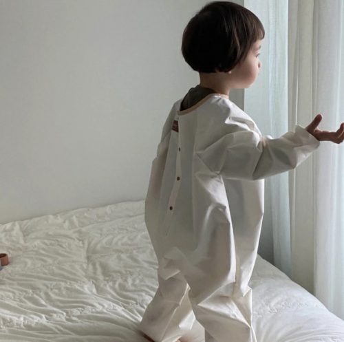 ゆったりしたサイズ感なので、なかにたくさん着込めるのが嬉しいポイント。後ろにはボタンが備わっているので、着脱しやすいのも大きな魅力です。また、パンツの裾だけでなく袖口にもゴムが入っているので、虫や汚れからしっかり守ってくれます。