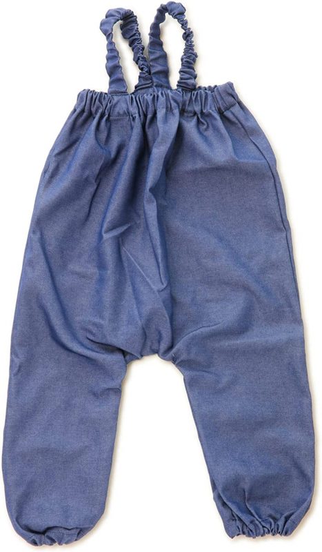 フロントにほどこされたポケットがアクセントのプレイウェア。肩ひもや胸周りにはゴムが入っているため、動きやすいのもポイントです。着脱しやすいサロペットタイプで、急な外遊びでもサッと着せられます。