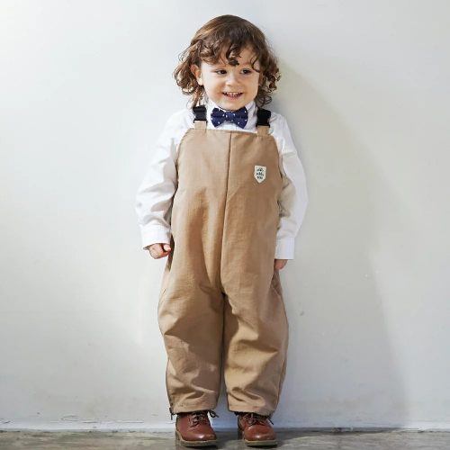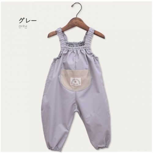 シンプルな無地デザインが特徴のサロペットタイプのプレイウェア。なかに柄のTシャツなどを入れて、おしゃれに着ることもできる1着です。