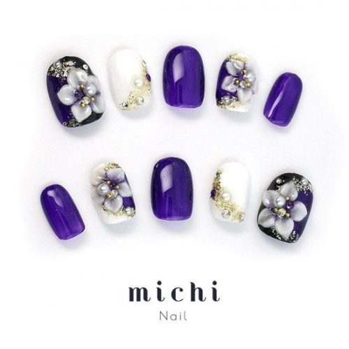 クールさと清楚さをあわせ持つ、可憐な紫のネイルチップ。百合をあしらいパールやラメをちりばめて、豪華さも演出しています。