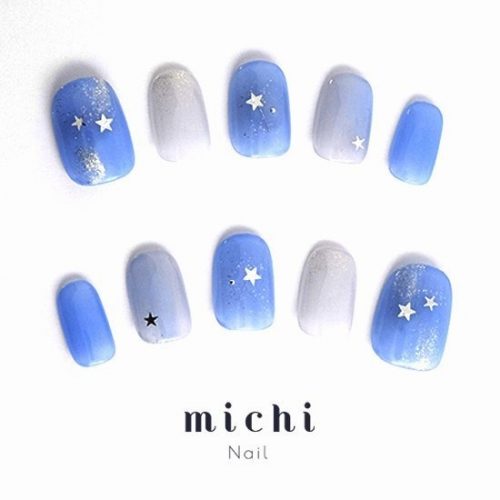 シアーな青色が魅力のネイルチップです。星型のチップとラメで彩られたかわいらしさがポイント。くすみ感のあるブルーグレーが、明け方の夜空のような落ち着きのある印象を与えます。