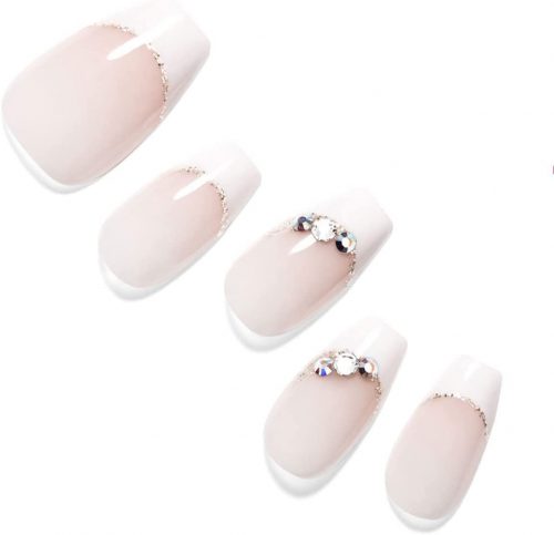 バレエシューズのような美しいフォルムのネイルチップ。爪先を縁取るように白をあしらった、清楚感あるフレンチネイルタイプです。フレンチネイルのライン部分にジュエルパーツとグリッターをあわせ、フレンチガーリーなデザインに仕上がっています。