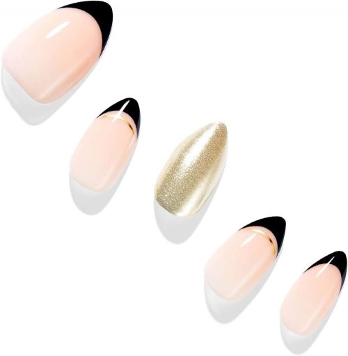 肌なじみのよいヌーディなカラーに、黒のフレンチラインをあしらったネイルチップ。メタリックなゴールドラインとゴールドネイルをプラスし、大人っぽいネイルに仕上がっています。