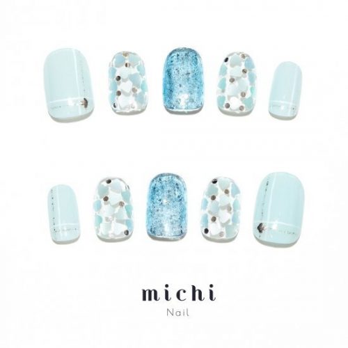 ジェリーのようなつや感のある見た目が魅力の、水色のネイルチップです。涼しげに仕上げたい夏場や、冬のクールさを堪能したいときにピッタリ。ハートをあしらったデザインもあり、かわいいスタイルにあわせるのもおすすめです。