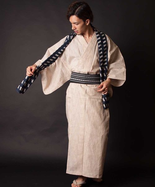 上品な印象を与えられる、ナチュラルな生成りのメンズ浴衣。主張しすぎない縦縞模様を採用しており、明るい色でもスタイリッシュに見せられます。綿・麻の混紡素材ですが、綿の割合が多いため、やわらかい肌触りを味わえるのが魅力です。