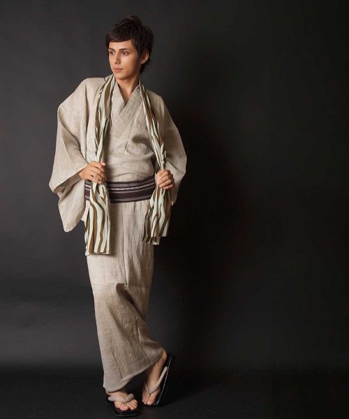 麻100%で作られた、ナチュラルな風合いのメンズ浴衣。麻の素材感が引き立つ生成りの色味が特徴で、落ち着いた印象を与えられます。明るい色ながら控えめな雰囲気があるので、初めて浴衣を着る方でもチャレンジしやすいのが魅力です。