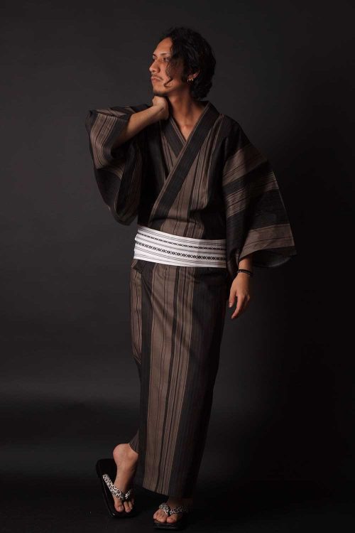 大人の渋さを醸し出す、茶色をベースにしたメンズ浴衣。インパクトのある縦縞模様がかっこよく、スタイリッシュな浴衣スタイルを楽しめます。ラフィアハットや、ハンチングを合わせた着こなしもおすすめです。