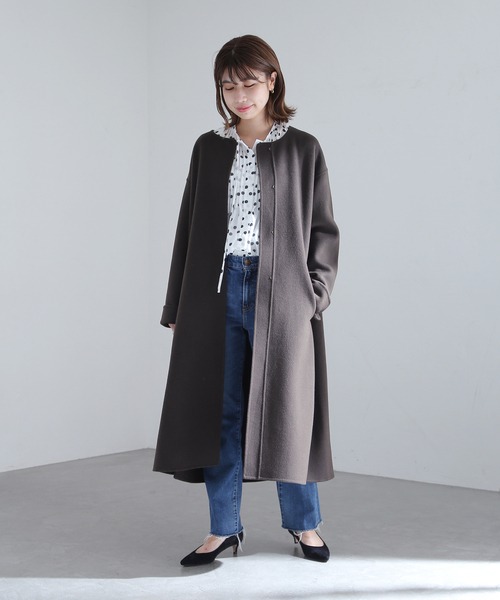 冬の通勤から普段のお出かけまで、幅広い活躍が期待できる1着です。顔周りがスッキリとしたノーカラータイプのコートなので、冬の定番アイテムであるタートルネックニットとも好相性。裾に向かって広がるフレアシルエットが女性らしさを引き立てます。
