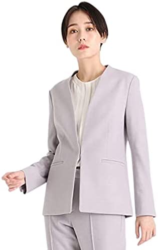 幅広い年代の女性におすすめの上品なノーカラージャケット。素材にはウールのようなあたたかみのある表情に仕上げたポリエステル生地を採用しています。