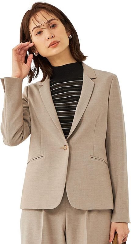 秋・冬・春と3シーズン着用できるおすすめジャケットです。ラペルが細くマニッシュな印象で、ハンサムなオフィスカジュアルコーデを目指す方におすすめ。首元がスッキリとしているため、ハイネックのインナーと合わせてもバランスよく着こなせます。