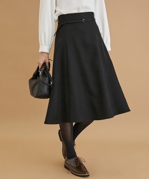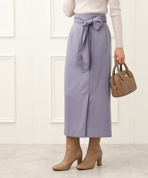ウエストリボンが目を引く大人かわいいスカートです。シンプルなニットと合わせるだけで、フェミニンな冬のオフィスカジュアルスタイルが実現。リボンは取り外しが可能で、ベーシックなスカートとしても使えます。