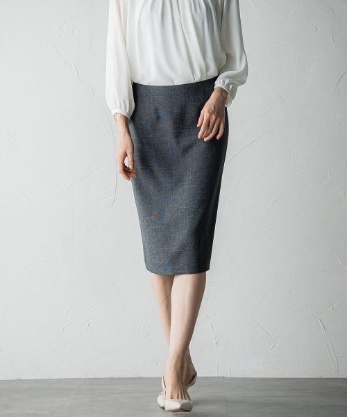 洗練された冬のオフィスカジュアルコーデが叶うおすすめのタイトストレートスカートです。冬ムードを高めるウール調の素材を採用。一見シンプルなデザインに見えますが、メランジ調のカラーに仕上げられており、地味見えしないのがポイントです。