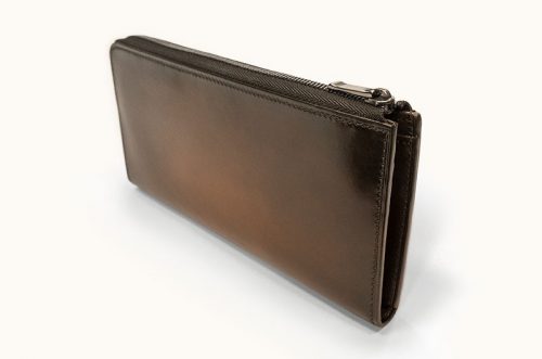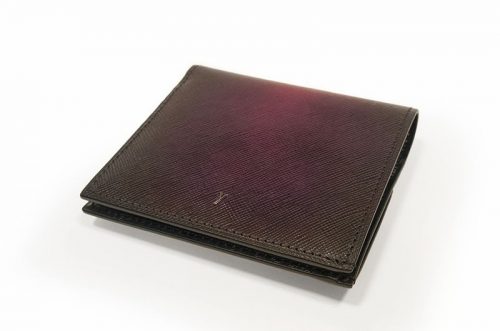 絵画のような色合いが目を引く革財布。ブランド独自の「ヴェラトゥーラ技法」を用いて染め上げ、染色後に加工を施すことで透明感のある美しい光沢を生み出しているのが特徴です。