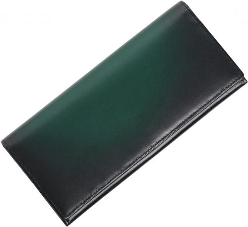 素材には内外ともに手作業でなめされたカーフレザーを使用。二つ折りタイプの長財布で、内側には2つの札入れと6枚のカードポケット、ファスナー付き小銭入れも配置。スリムな構造ながら収納面でも充実しています。スマートさを重視するビジネスパーソンにおすすめの革財布です。