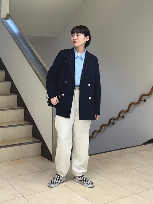 かっちりとしたテーラードジャケットとジョガーパンツを組み合わせた、トラッドカジュアルコーデです。ジャケットのきちんとした印象と、ジョガーパンツ・スニーカーのカジュアルな組み合わせがおしゃれ。友人とのお出かけ・美術館デートにぴったりな着こなしです。