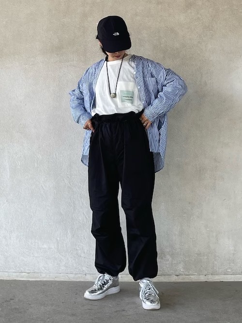 ブラックのイージーパンツと、ストライプシャツを組み合わせた、最低気温が19度の日におすすめのストリートコーデ。全体的にゆったりとしたサイズ感で合わせた、メンズライクなスタイルです。インナーのTシャツをタックインすることで、アクセントを加えています。