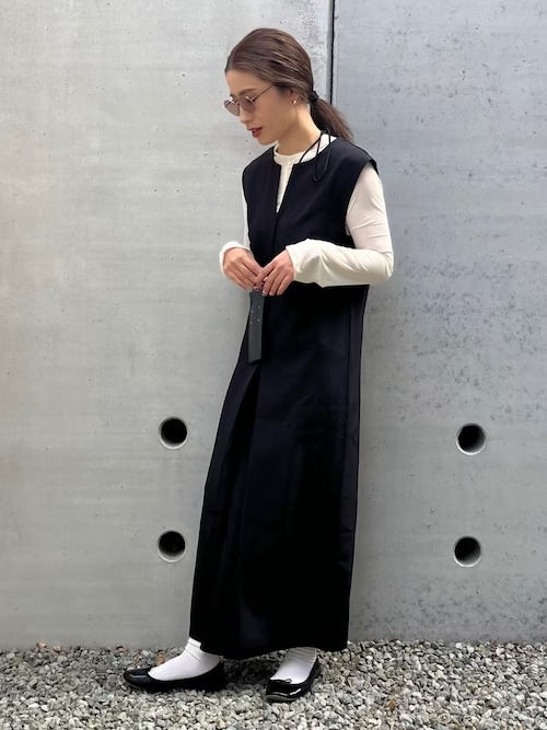 ブラックのジャンパースカートを使った、最低気温19度の日におすすめのコーディネート。美しいIラインシルエットで、女性らしい印象を与えられます。足元はフラットなバレエシューズを選び、程よい抜け感を加えることがポイントです。