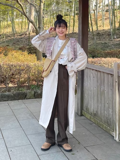 秋にぴったりなベージュ×ブラウンを基調にした、最低気温19度の雨の日におすすめのコーディネート。ロング丈のトレンチコートは、気温が上がりにくい雨の日に役立ちます。インナーにプリントロンTシャツを合わせた、旬なスタイルです。